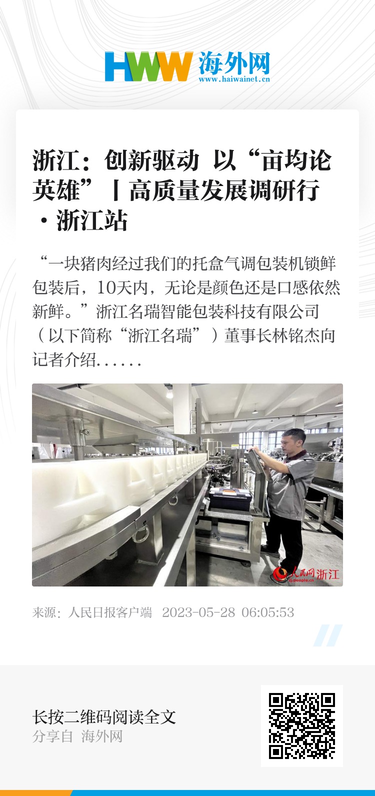 “一块猪肉经过我们的托盒气调包装机锁鲜包装后,10天内,无论是颜色还是口感依然新鲜。”浙江名瑞智能包装科技有限公司(以下简称“浙江名瑞”)董事长林铭杰向记者介绍了主推产品托盒气调包装机。据悉,2021年该公司自主研发的“真空包装机”获得了浙江省首(台)套认定。