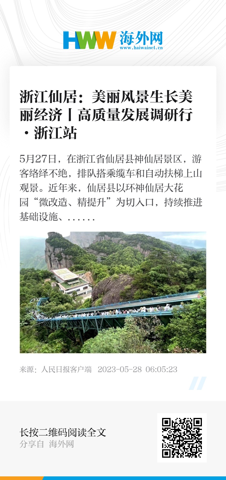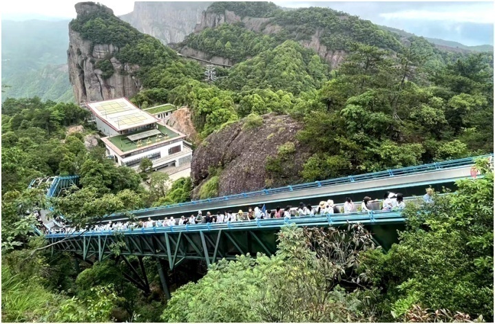 5月27日,在浙江省仙居县神仙居景区,游客络绎不绝,排队搭乘缆车和自动扶梯上山观景。