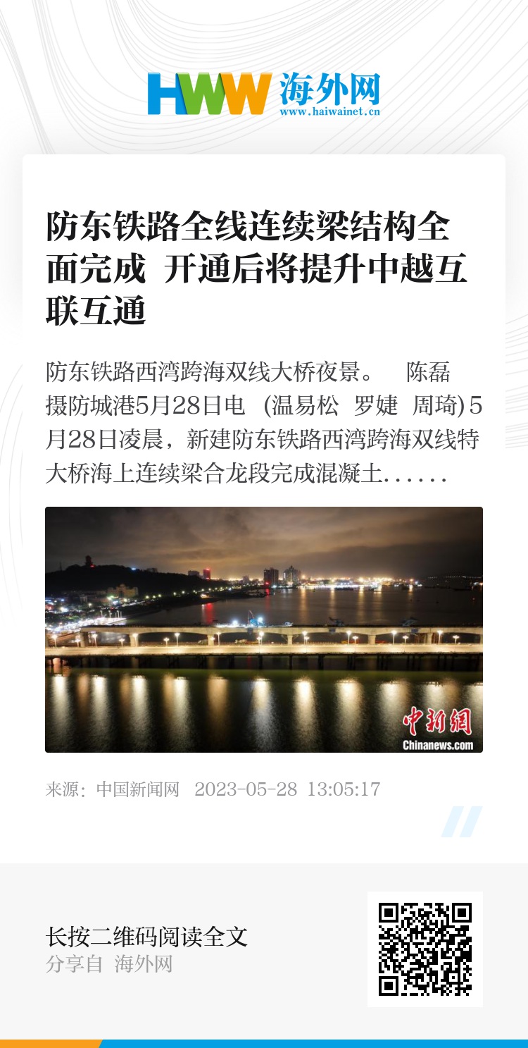 中新网防城港5月28日电 (温易松 罗婕 周琦)5月28日凌晨,新建防东铁路西湾跨海双线特大桥海上连续梁合龙段完成混凝土浇筑,标志着这座大桥6联连续梁全部完成合龙。至此,防东铁路全线连续梁结构全面完成,为今年全线开通运营奠定坚实基础。