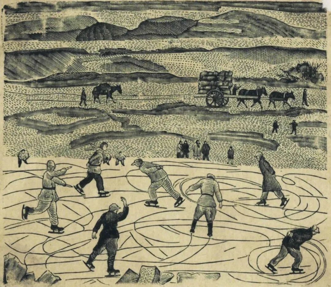 延河溜冰 刘岘 版画 9.6×11.1cm 1941年