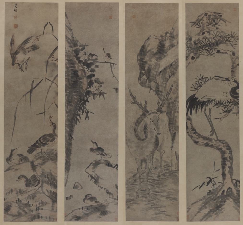 鹤鹿凫雁图 朱耷 中国画 清代 180.5cm × 44.1 cm×4 中国美术馆藏