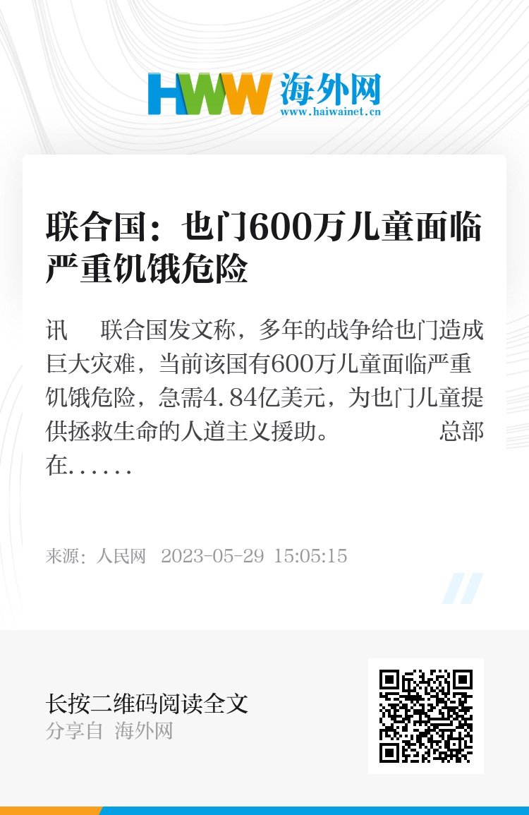 联合国儿童基金会3月下旬曾发布报告说,也门有1100多万儿童需要人道主义援助,其中220万儿童严重营养不良。报告强调,急需至少4.84亿美元,以在2023年继续为也门儿童提供拯救生命的人道主义救援。