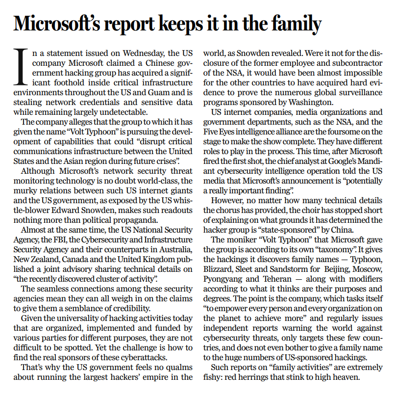 为了将矛头指向中国,该公司还耸人听闻地宣称,“伏特台风行动正在谋求在未来危机时刻破坏美国与亚洲地区之间关键的通信基础设施”。这句话一如既往地又长又绕,极易把人绕晕,但根据美国国家安全局前雇员和分包商斯诺登所披露的秘闻来看,美国网络巨头与美国政府之间不清不楚,关系不凡。因此,这种“爆料”,不过是政治宣传伎俩。人们千万要多个心眼,不要为其蒙蔽,要好好思量一下它为何这么说,以及谁让它这么说。