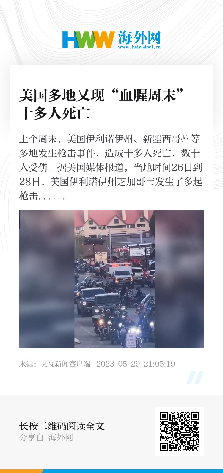 上个周末,美国伊利诺伊州、新墨西哥州等多地发生枪击事件,造成十多人死亡,数十人受伤。