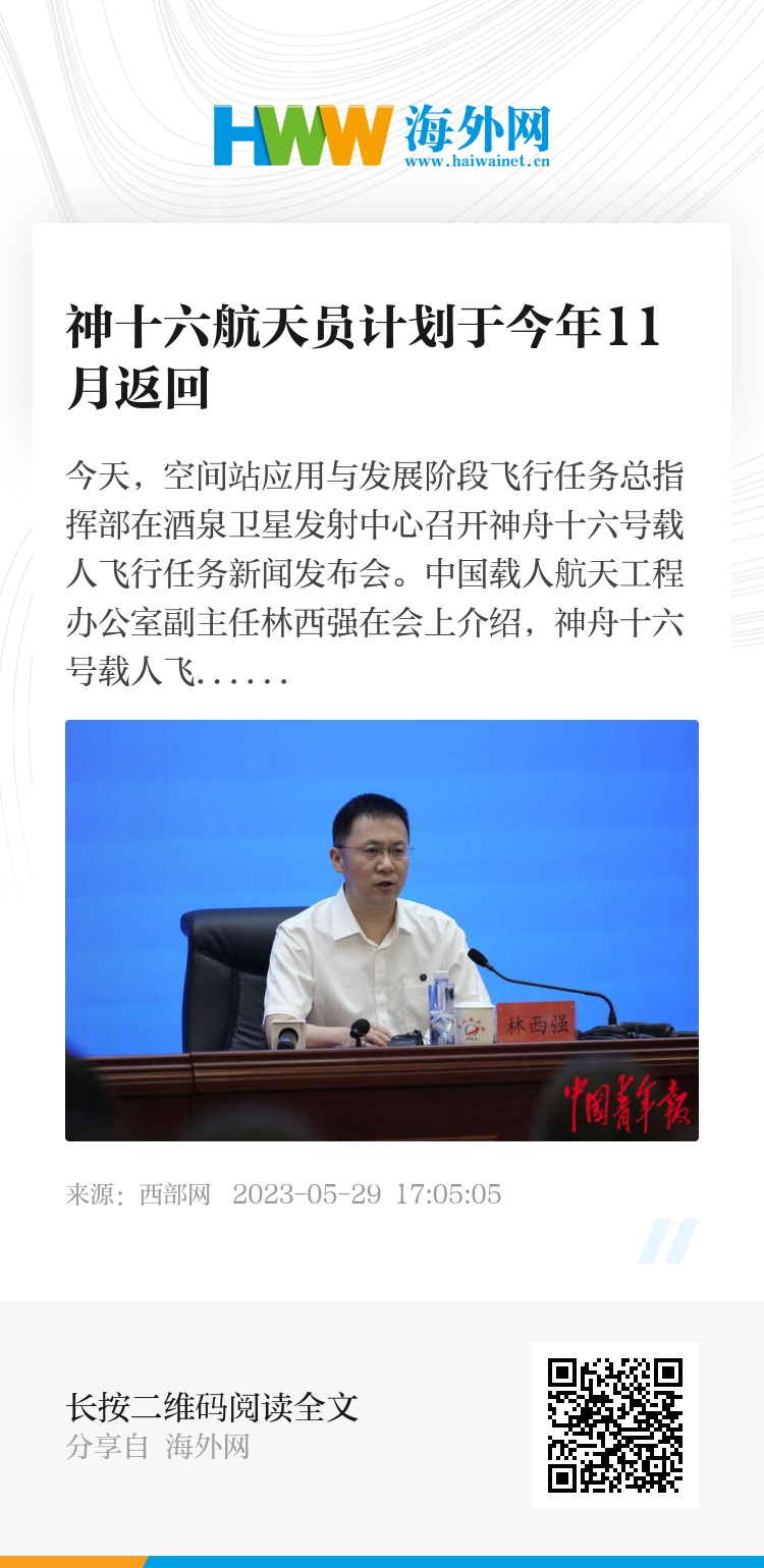 今天,空间站应用与发展阶段飞行任务总指挥部在酒泉卫星发射中心召开神舟十六号载人飞行任务新闻发布会。中国载人航天工程办公室副主任林西强在会上介绍,神舟十六号载人飞船入轨后,将采用自主快速交会对接模式对接于天和核心舱径向端口,形成三舱三船组合体。在轨驻留期间,神舟十六号航天员乘组将迎来神舟十七号载人飞船的来访对接,计划于今年11月返回东风着陆场。