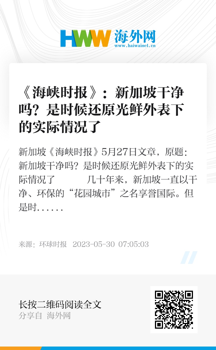 新加坡《海峡时报》5月27日文章,原题:新加坡干净吗?是时候还原光鲜外表下的实际情况了 几十年来,新加坡一直以干净、环保的“花园城市”之名享誉国际。但是时候面对现实了,这种认识已经脱离现实了。