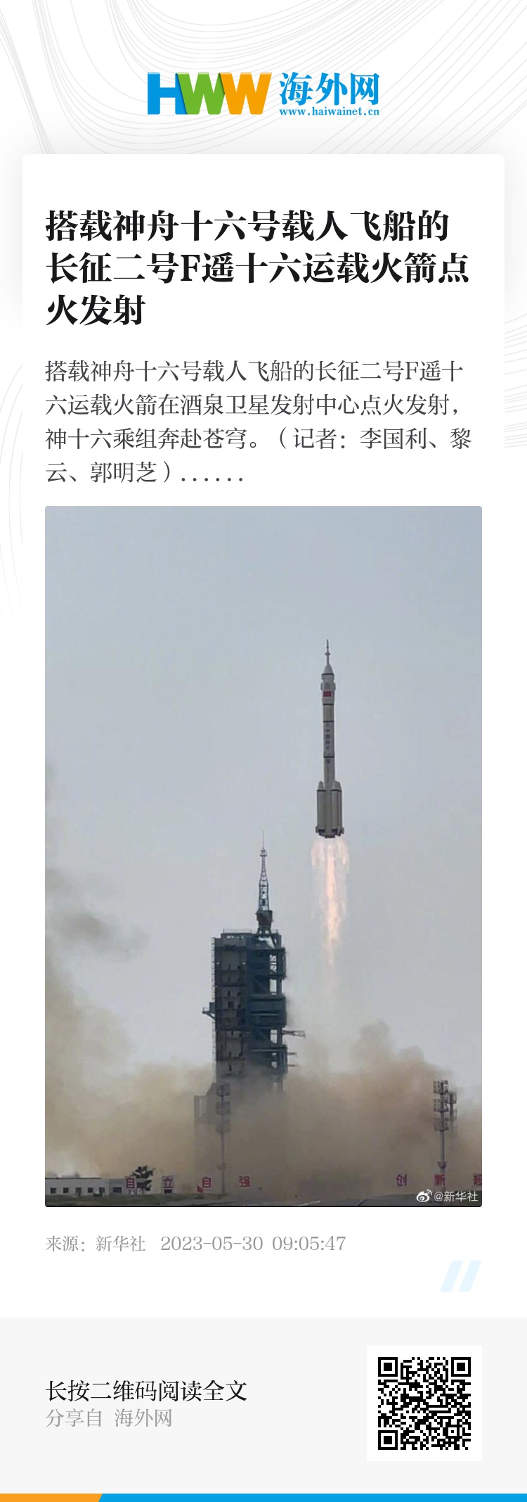 搭载神舟十六号载人飞船的长征二号F遥十六运载火箭在酒泉卫星发射中心点火发射,神十六乘组奔赴苍穹。(记者:李国利、黎云、郭明芝)