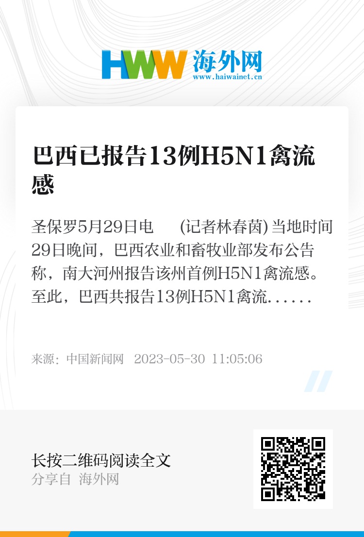 当地时间15日,巴西报告首例禽流感病例。22日,巴西进入为期6个月的动物卫生紧急状态。至此,巴西总共报告13例H5N1禽流感,其中圣埃斯皮里图州9例,里约热内卢州3例,南大河州1例。