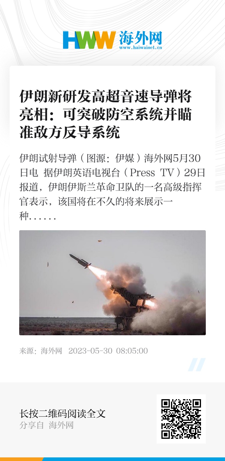 海外网5月30日电 据伊朗英语电视台(Press TV)29日报道,伊朗伊斯兰革命卫队的一名高级指挥官表示,该国将在不久的将来展示一种国产高超音速弹道导弹,这款新型导弹能够突破所有防空导弹系统并瞄准敌方反导系统。