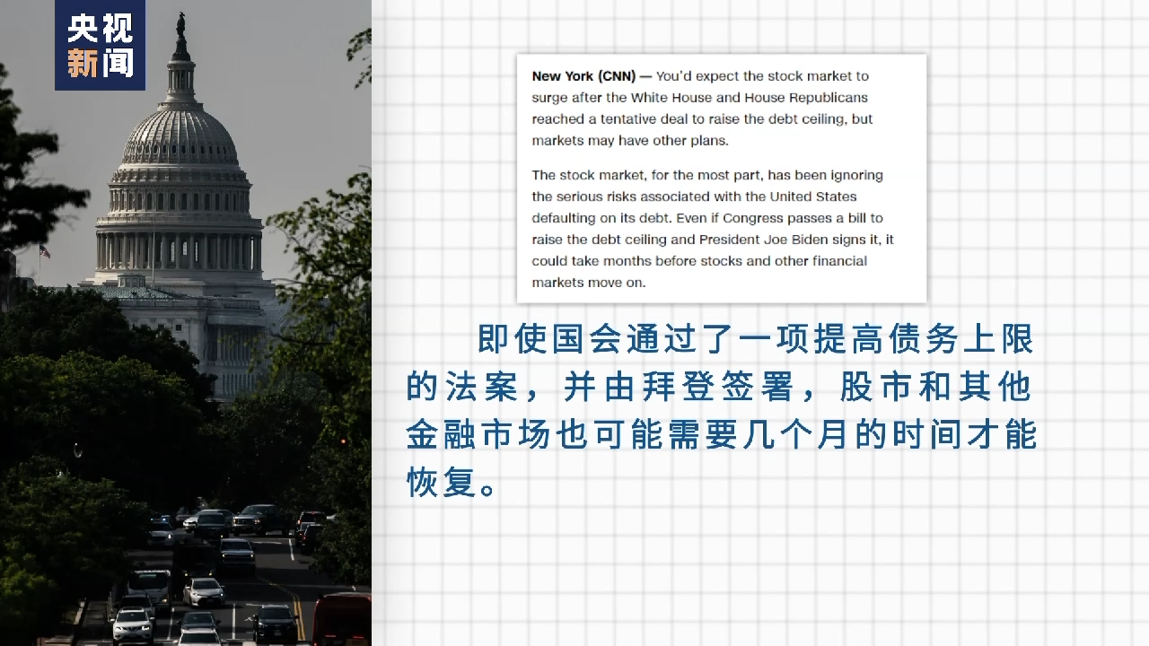 此外,即便两党就债务上限达成初步一致,未来股市走向仍不容乐观。美国有线电视新闻网29日发表文章,题为《别指望股市会为债务上限协议感到高兴》。文章写道,“即使国会通过了一项提高债务上限的法案,并由拜登签署,股市和其他金融市场也可能需要几个月的时间才能恢复。”