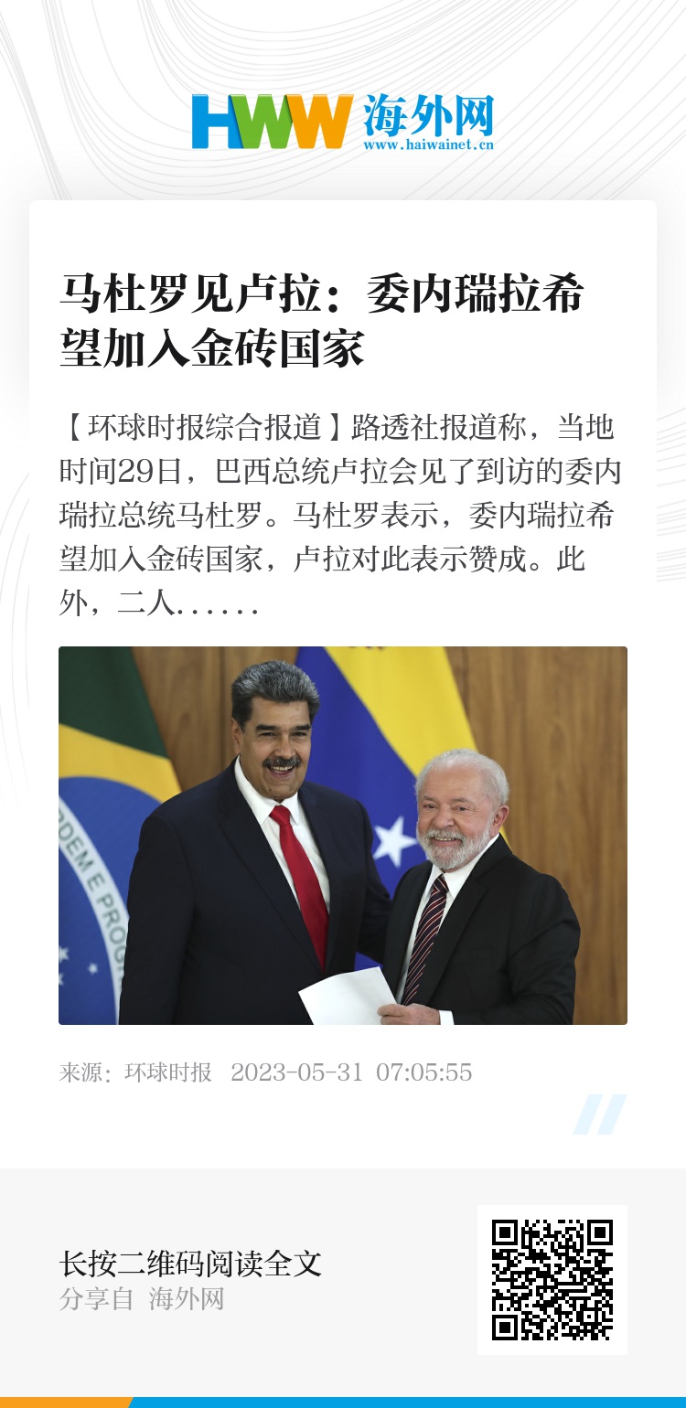 【环球时报综合报道】路透社报道称,当地时间29日,巴西总统卢拉会见了到访的委内瑞拉总统马杜罗。马杜罗表示,委内瑞拉希望加入金砖国家,卢拉对此表示赞成。此外,二人谴责美国对委内瑞拉的制裁,卢拉称美国的制裁“极其夸张”。