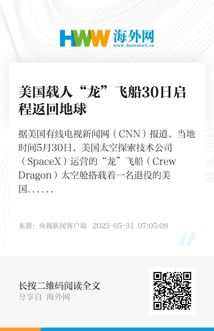 据悉,太空舱预计将于30日晚上11时4分在佛罗里达海岸附近着陆。(央视记者 许弢)