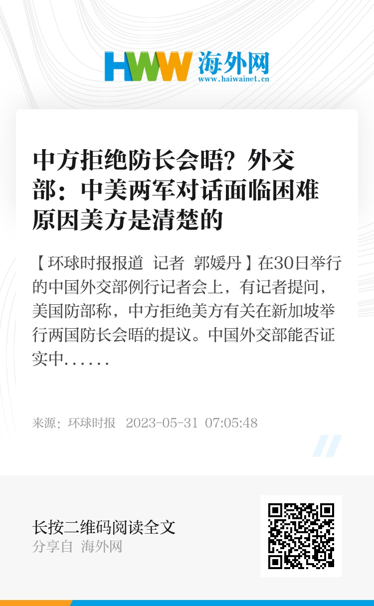 【环球时报报道 记者 郭媛丹】在30日举行的中国外交部例行记者会上,有记者提问,美国防部称,中方拒绝美方有关在新加坡举行两国防长会晤的提议。中国外交部能否证实中方拒绝会晤提议并介绍原因?对此,外交部发言人毛宁回应称,当前,中美两军对话面临困难的原因美方是清楚的。美方应当切实尊重中国的主权、安全和利益关切,立即纠正错误做法,展现诚意,为中美两军对话沟通创造必要的氛围和条件。