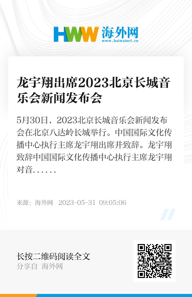 5月30日,2023北京长城音乐会新闻发布会在北京八达岭长城举行。中国国际文化传播中心执行主席龙宇翔出席并致辞。