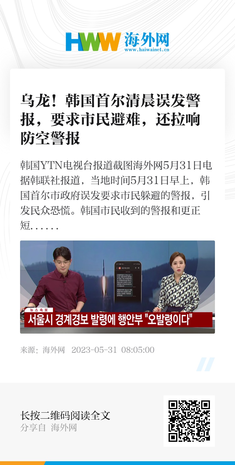 海外网5月31日电 据韩联社报道,当地时间5月31日早上,韩国首尔市政府误发要求市民躲避的警报,引发民众恐慌。