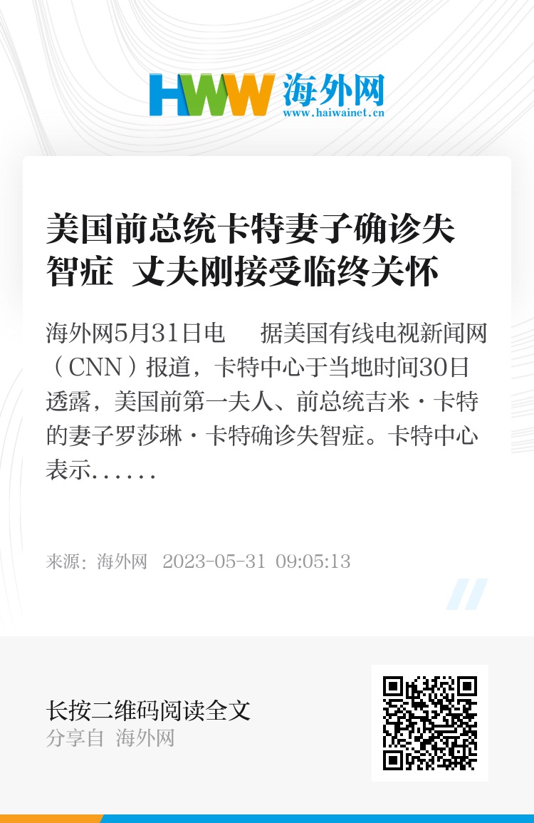 海外网5月31日电 据美国有线电视新闻网(CNN)报道,卡特中心于当地时间30日透露,美国前第一夫人、前总统吉米·卡特的妻子罗莎琳·卡特确诊失智症。
