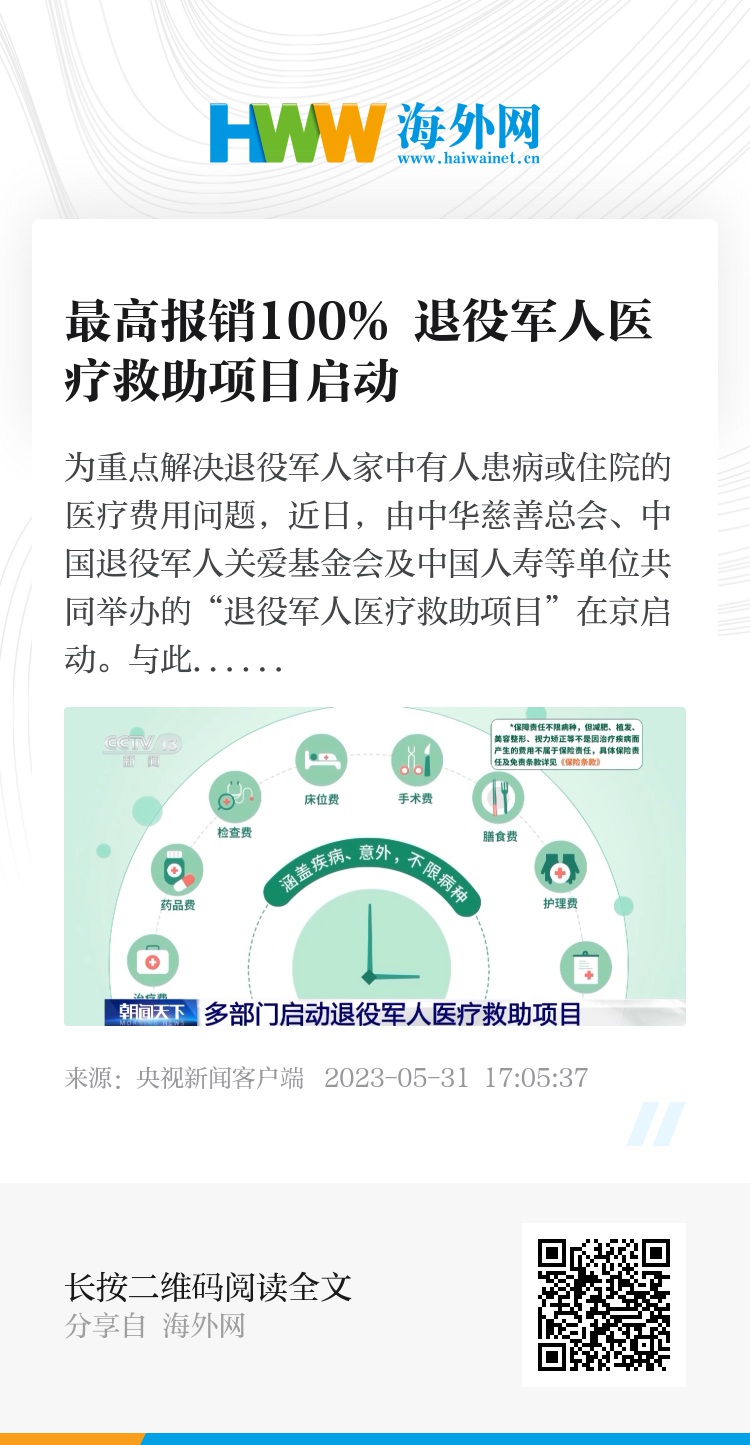 为重点解决退役军人家中有人患病或住院的医疗费用问题,近日,由中华慈善总会、中国退役军人关爱基金会及中国人寿等单位共同举办的“退役军人医疗救助项目”在京启动。与此同时,“退役军人家庭全年医疗费用保险卡”也正式上线。