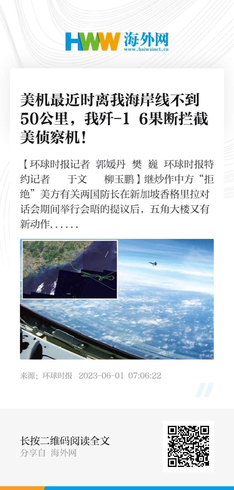 美印太司令部5月30日发表声明称,26日,一架中国歼-16战斗机飞行员在拦截一架美国空军RC-135飞机期间做出“不必要的咄咄逼人的动作”;中国飞行员“直接飞到RC-135的机头前方约400英尺(约合122米)处”,迫使美机飞过其尾流湍流。声明还称,这架RC-135当时“正依据国际法在南海国际空域开展安全例行行动”。
