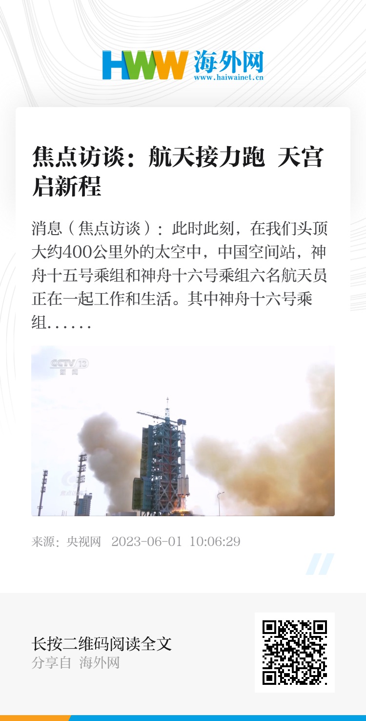 央视网消息(焦点访谈):此时此刻,在我们头顶大约400公里外的太空中,中国空间站,神舟十五号乘组和神舟十六号乘组六名航天员正在一起工作和生活。其中神舟十六号乘组景海鹏、朱杨柱和桂海潮是昨天(5月30日)从发射塔架搭乘神舟十六号飞船,在长二F遥十六运载火箭的托举之下前往中国空间站的。在中国空间站进入应用与发展阶段以来,我们似乎已经习惯了每过半年左右就有航天员出发,去往中国的太空之家,正是在一棒棒交接中,我们不断拓展中国探索宇宙的能力和信心。