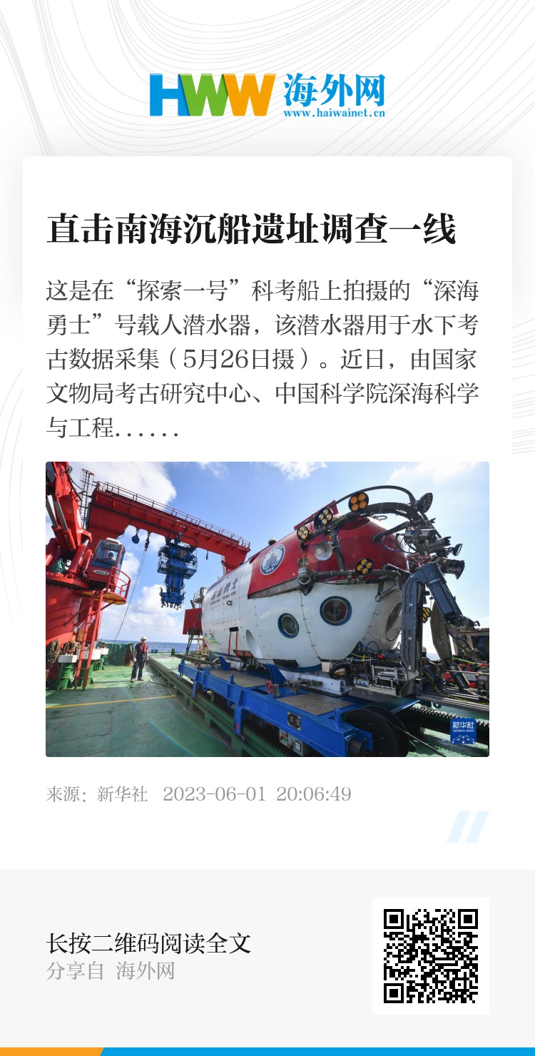 近日,由国家文物局考古研究中心、中国科学院深海科学与工程研究所、中国(海南)南海博物馆联合组成的深海考古队搭乘“探索一号”科考船,在南海西北陆坡一号、二号沉船遗址海域进行第一阶段调查。该科考船载有“深海勇士”号载人潜水器,用于水下考古数据采集。新华社记者随船跟访,直击调查一线。