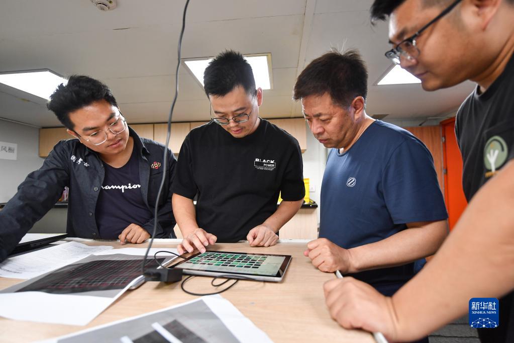 考古队员在“探索一号”科考船上查看从水下采集的考古数据(5月24日摄)。新华社记者 蒲晓旭 摄