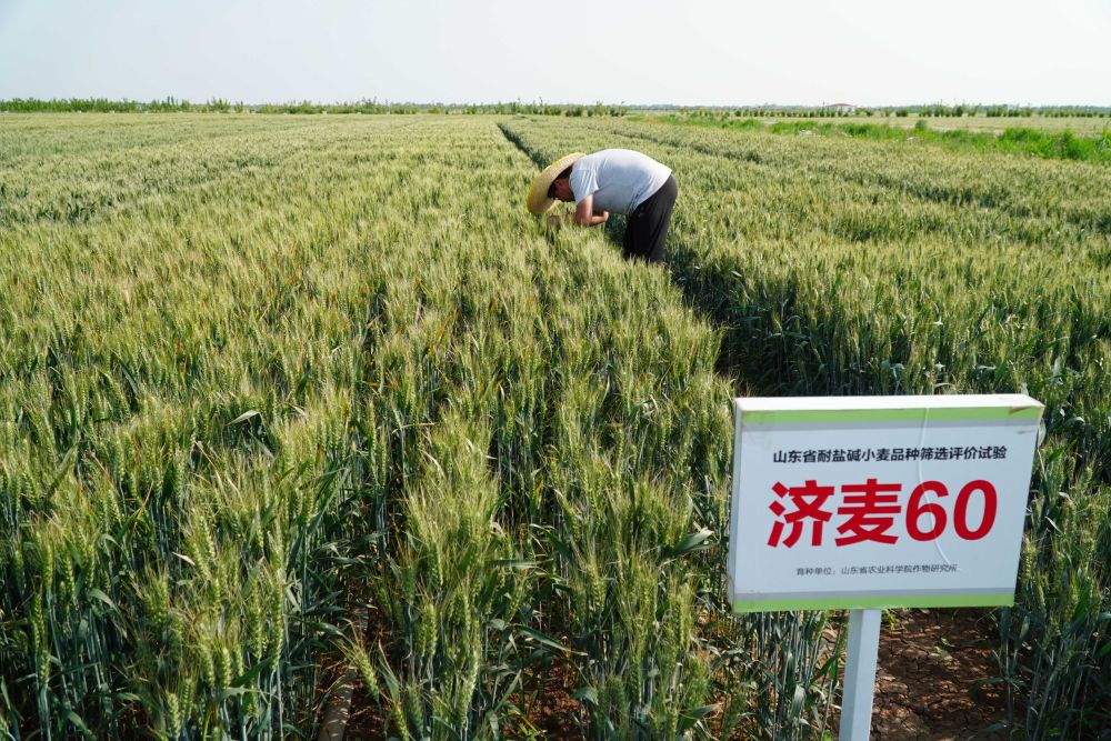 “这是山东省农业科学院作物所小麦遗传育种团队专门针对旱地、盐碱地培育的新品种。”山东省农业科学院作物所研究员曹新有说,2022年夏收时测产,在土壤含盐量3.75‰的土地上,“济麦60”平均亩产460.98公斤,创盐碱地小麦高产纪录。