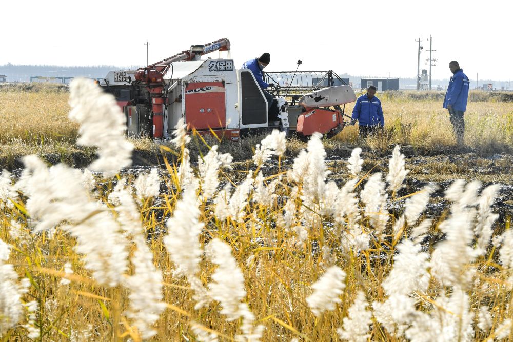 在吉林省大安市海坨乡盐碱地生态修复治理示范基地,农民驾驶收割机收割水稻(2022年10月12日摄)。新华社记者 许畅 摄