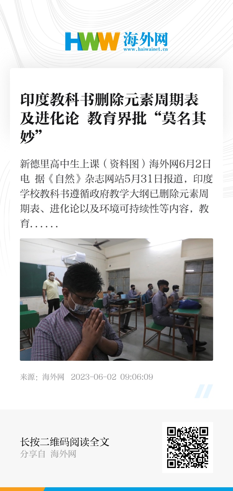 海外网6月2日电 据《自然》杂志网站5月31日报道,印度学校教科书遵循政府教学大纲已删除元素周期表、进化论以及环境可持续性等内容,教育界对此感到“莫名其妙”。