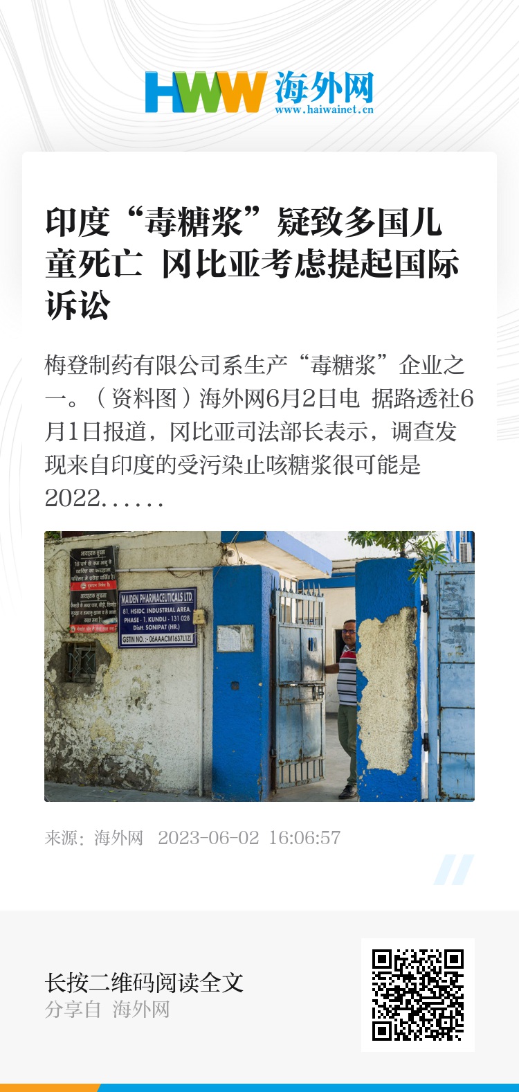 海外网6月2日电 据路透社6月1日报道,冈比亚司法部长表示,调查发现来自印度的受污染止咳糖浆很可能是2022年导致数十名儿童死亡的诱因,冈比亚已聘请一家美国律所探讨对印度采取国际诉讼等法律行动。