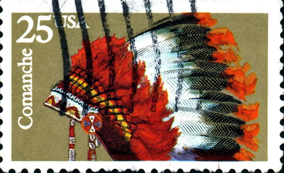 印有科曼奇印第安人头饰的邮票。摄影/Blue Moon,来源/Adobe Stock图虫创意