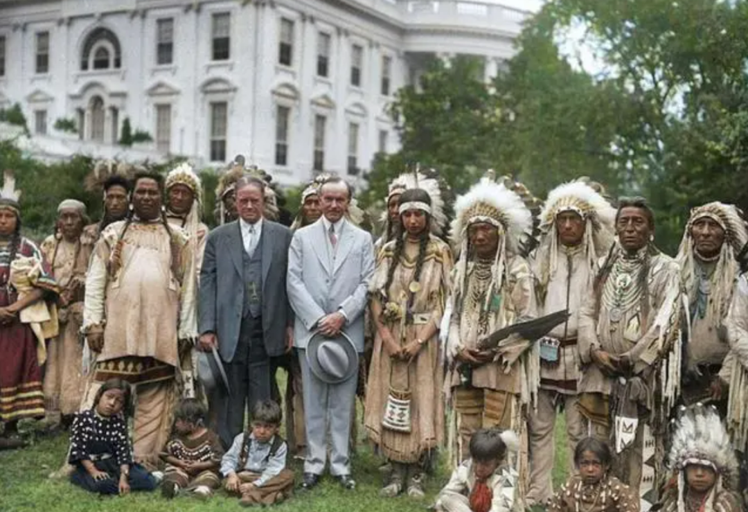 1927年,美国总统柯立芝在白宫外与来访的印第安人合影