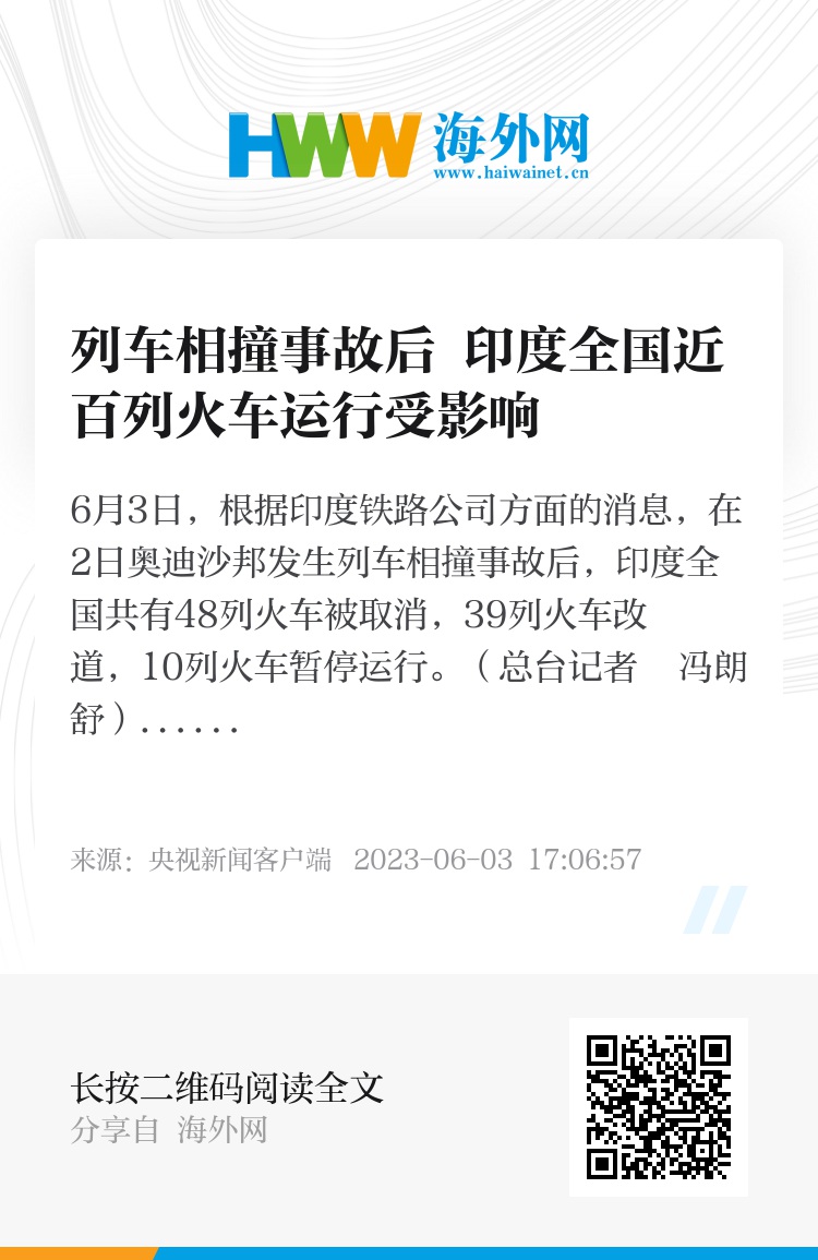 6月3日,根据印度铁路公司方面的消息,在2日奥迪沙邦发生列车相撞事故后,印度全国共有48列火车被取消,39列火车改道,10列火车暂停运行。(总台记者 冯朗舒)