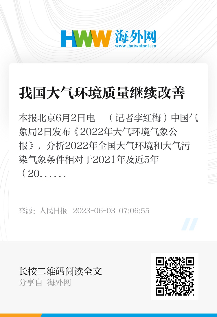 本报北京6月2日电 (记者李红梅)中国气象局2日发布《2022年大气环境气象公报》,分析2022年全国大气环境和大气污染气象条件相对于2021年及近5年(2017年至2021年)平均情况变化。公报显示,2022年全国大气环境质量继续改善,长期来看,我国大气环境整体呈现向好趋势。