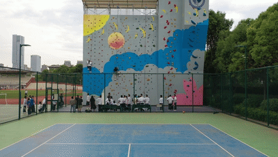 毕业班学生来到校内的攀岩墙下