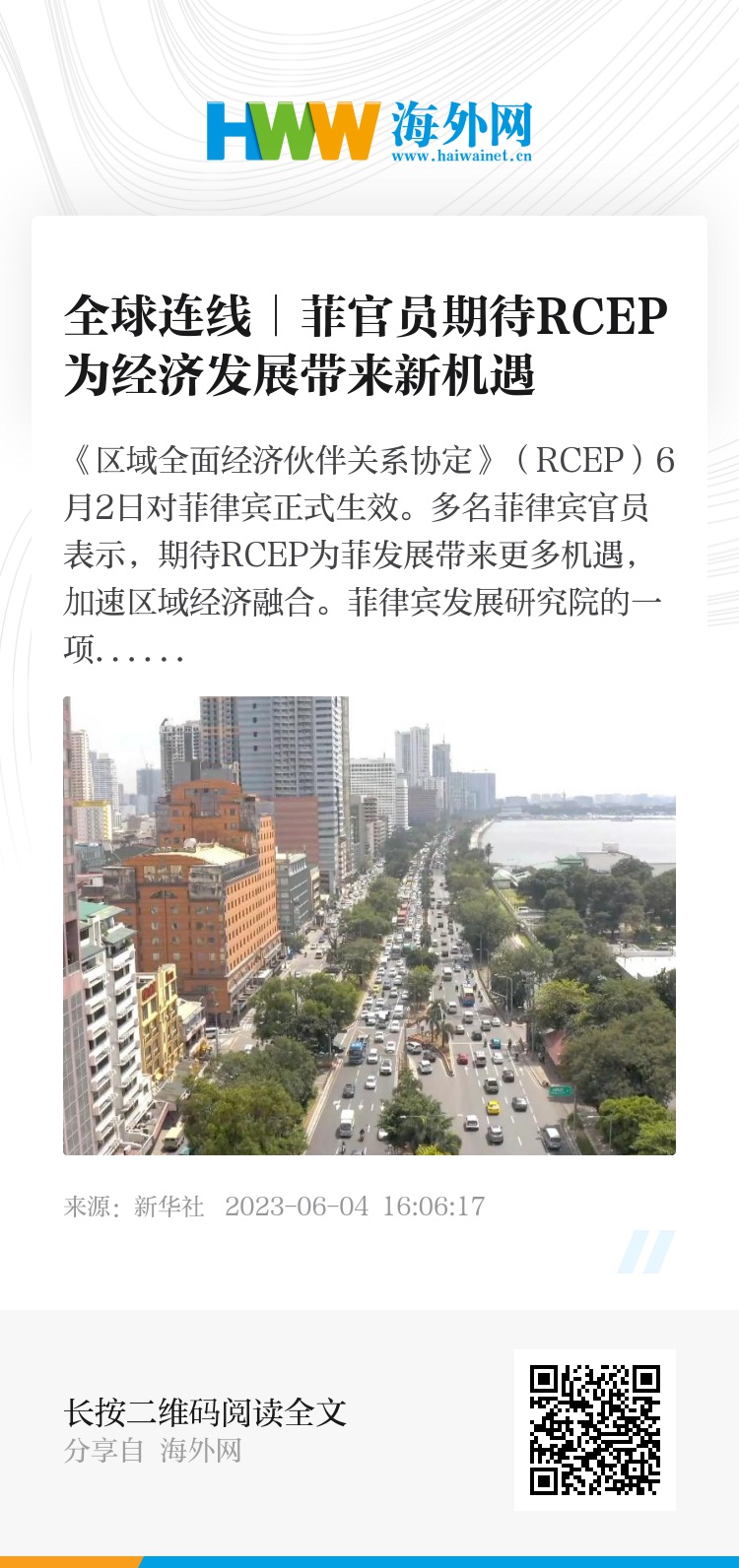 《区域全面经济伙伴关系协定》(RCEP)6月2日对菲律宾正式生效。多名菲律宾官员表示,期待RCEP为菲发展带来更多机遇,加速区域经济融合。