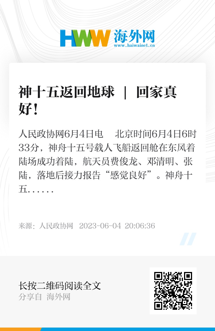 人民政协网6月4日电 北京时间6月4日6时33分,神舟十五号载人飞船返回舱在东风着陆场成功着陆,航天员费俊龙、邓清明、张陆,落地后接力报告“感觉良好”。神舟十五号飞行乘组完成了在轨所有工作和任务现在顺利回到了祖国,他们脸上洋溢着自信的微笑。(摄影: 顾建文)