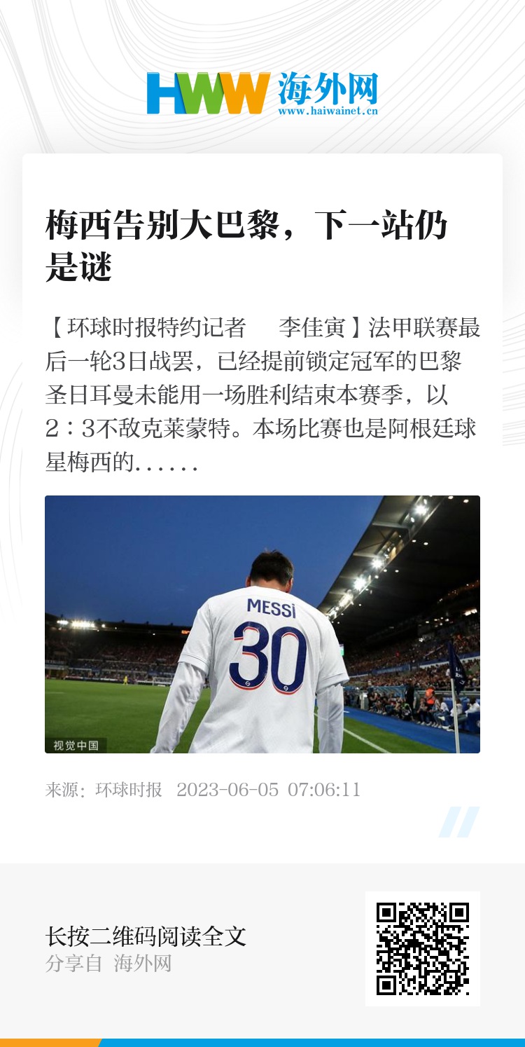【环球时报特约记者 李佳寅】法甲联赛最后一轮3日战罢,已经提前锁定冠军的巴黎圣日耳曼未能用一场胜利结束本赛季,以2∶3不敌克莱蒙特。本场比赛也是阿根廷球星梅西的法甲“谢幕战”,大巴黎在声明中表示:“经过两年的冒险,梅西在巴黎圣日耳曼的旅程迎来终点。俱乐部衷心感谢这位七届金球奖得主,他为球队夺得两座法甲冠军和1座法超杯。”
