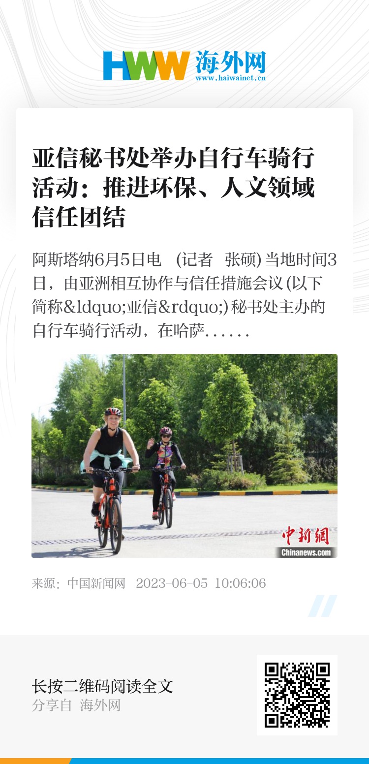 据主办方介绍,2022年6月,亚信秘书处在哈首都阿斯塔纳举办了首届“世界自行车日”骑行活动,哈外交部负责人、多国驻哈使节及国际组织代表等约100人参加了活动。(完)