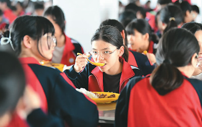 近年来,安徽省阜阳市阜南县各配备有营养餐的学校严把食品卫生关,让学生的营养餐真正成为阳光餐、幸福餐。图为5月17日,阜南县黄岗镇靳成学校的学生们在食堂吃午饭。