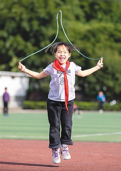 近年来,贵州省从江县各中小学校坚持确保学生每天锻炼1小时,促进青少年儿童健康成长。图为3月13日,从江县刚边壮族乡中心小学学生在体育课上跳绳。