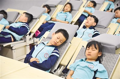 近年来,河北省邯郸市复兴区先后投入360余万元,购置躺式桌椅、固定床、折叠床、睡垫,解决孩子餐后睡眠的难题。图为5月29日,在复兴区百花第二小学,学生们使用“躺式课桌椅”午休。