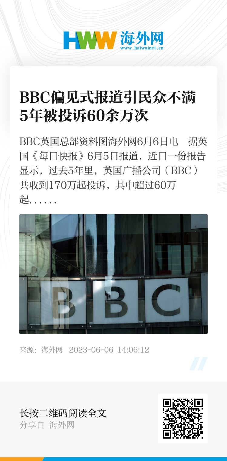 海外网6月6日电 据英国《每日快报》6月5日报道,近日一份报告显示,过去5年里,英国广播公司(BBC)共收到170万起投诉,其中超过60万起与报道偏见有关,但只有25起投诉中涉及的偏见得到了BBC行政投诉部门的承认。