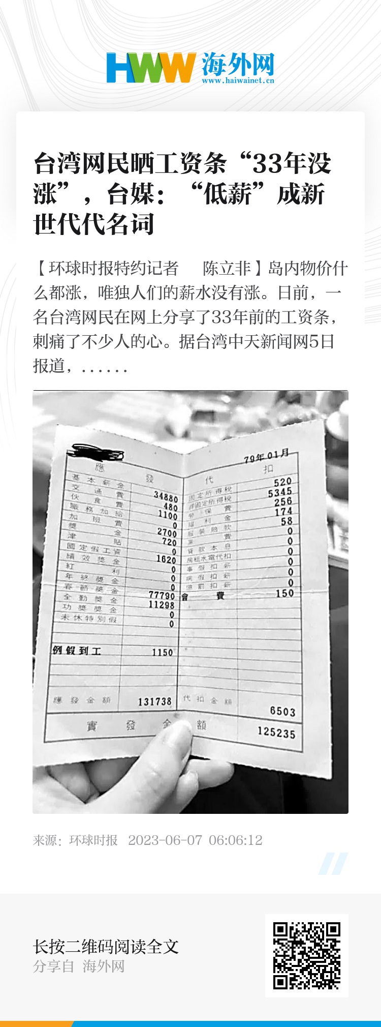 【环球时报特约记者 陈立非】岛内物价什么都涨,唯独人们的薪水没有涨。日前,一名台湾网民在网上分享了33年前的工资条,刺痛了不少人的心。