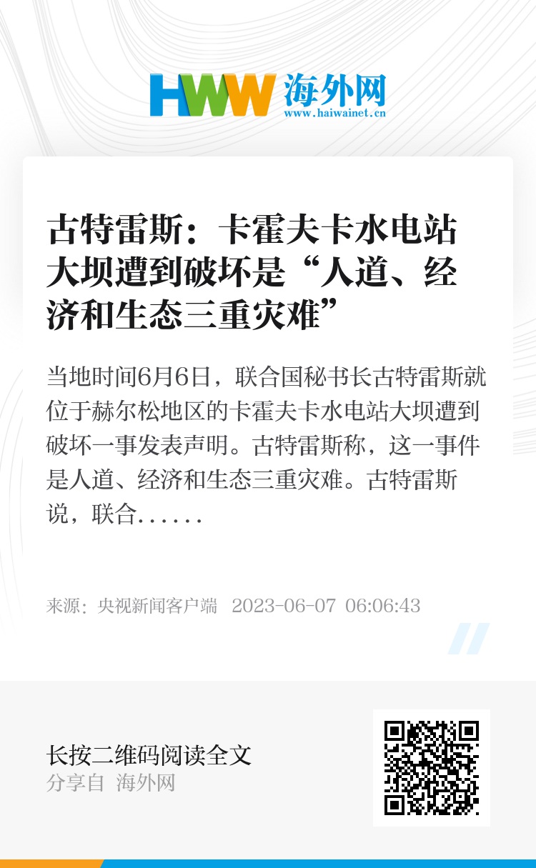 当地时间6月6日,联合国秘书长古特雷斯就位于赫尔松地区的卡霍夫卡水电站大坝遭到破坏一事发表声明。古特雷斯称,这一事件是人道、经济和生态三重灾难。