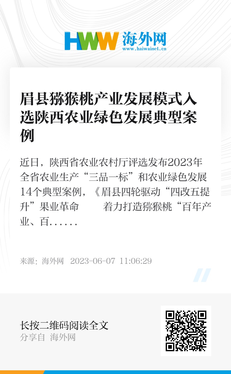 近日,陕西省农业农村厅评选发布2023年全省农业生产“三品一标”和农业绿色发展14个典型案例,《眉县四轮驱动“四改五提升”果业革命 着力打造猕猴桃“百年产业、百亿产值”》被评为陕西省农业绿色发展典型案例。