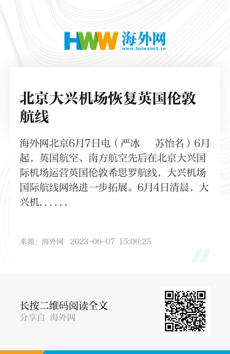 海外网北京6月7日电(严冰 苏怡名)6月起,英国航空、南方航空先后在北京大兴国际机场运营英国伦敦希思罗航线,大兴机场国际航线网络进一步拓展。