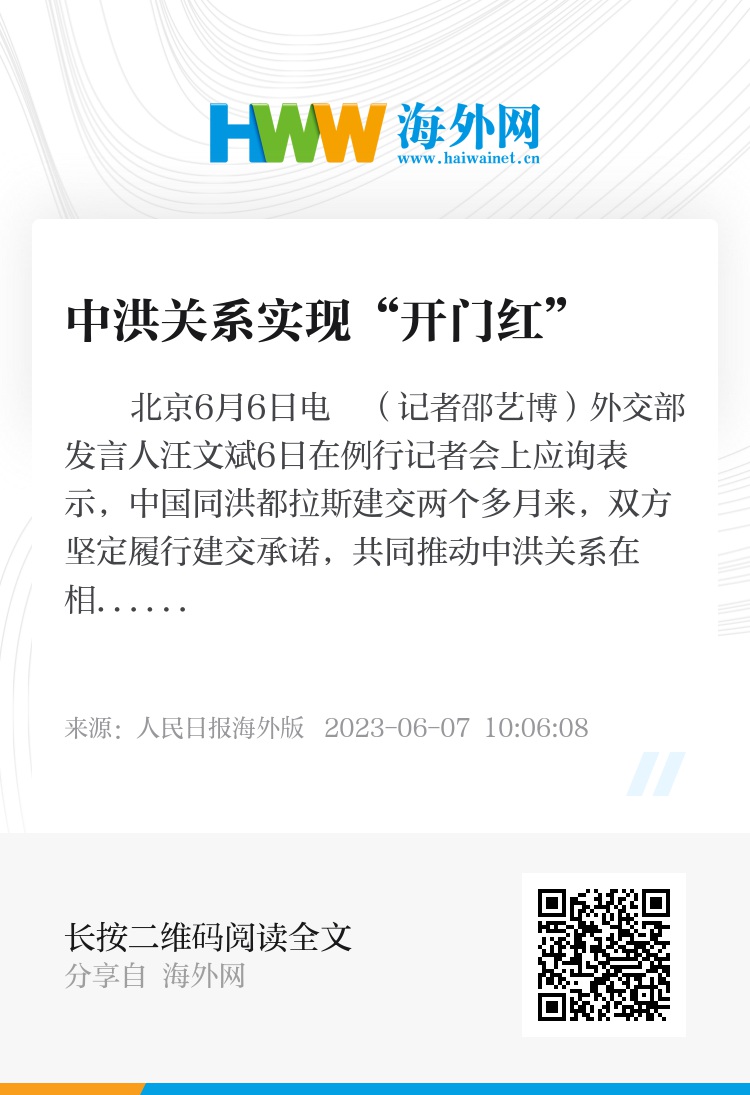新华社北京6月6日电 (记者邵艺博)外交部发言人汪文斌6日在例行记者会上应询表示,中国同洪都拉斯建交两个多月来,双方坚定履行建交承诺,共同推动中洪关系在相互尊重、平等互利、共同发展的基础上强劲起步,取得一系列早期收获,实现“开门红”。