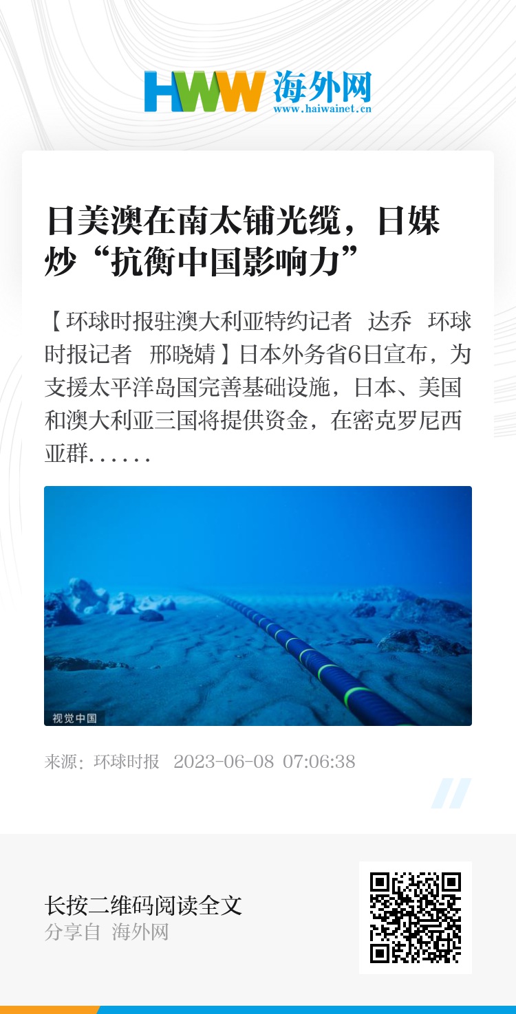 【环球时报驻澳大利亚特约记者 达乔 环球时报记者 邢晓婧】日本外务省6日宣布,为支援太平洋岛国完善基础设施,日本、美国和澳大利亚三国将提供资金,在密克罗尼西亚群岛地区铺设约2250公里的海底光缆,力争2025年前后铺设完毕。日本共同社称,此举旨在与海洋活动频繁且力图在南太平洋扩大影响力的中国抗衡,推进“自由开放的印度—太平洋”的实现。