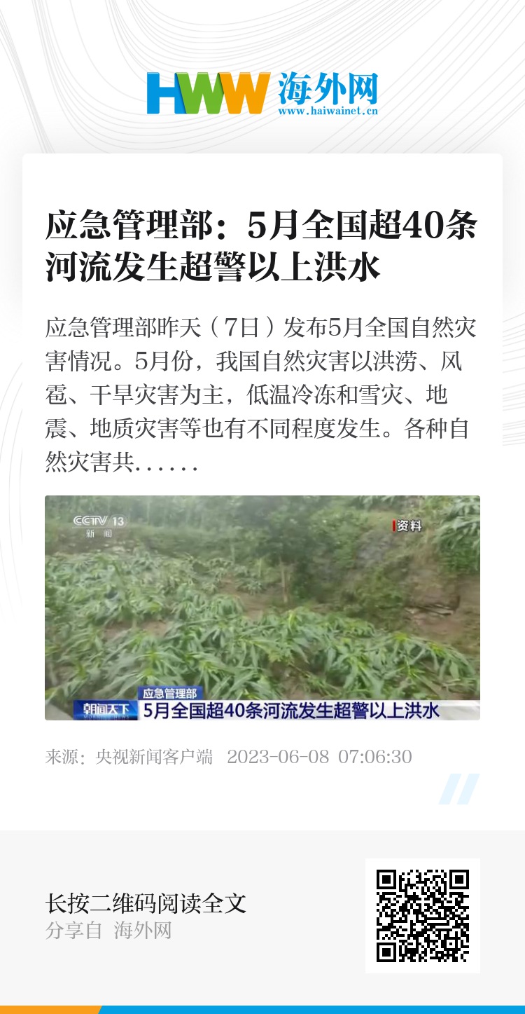 应急管理部昨天(7日)发布5月全国自然灾害情况。5月份,我国自然灾害以洪涝、风雹、干旱灾害为主,低温冷冻和雪灾、地震、地质灾害等也有不同程度发生。各种自然灾害共造成958.4万人次受灾。