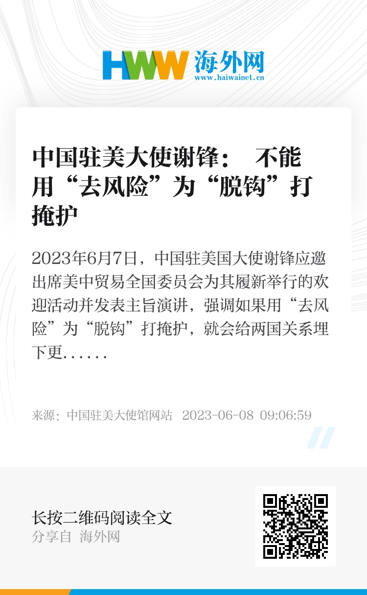 2023年6月7日,中国驻美国大使谢锋应邀出席美中贸易全国委员会为其履新举行的欢迎活动并发表主旨演讲,强调如果用“去风险”为“脱钩”打掩护,就会给两国关系埋下更多钉子。